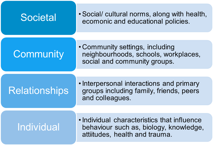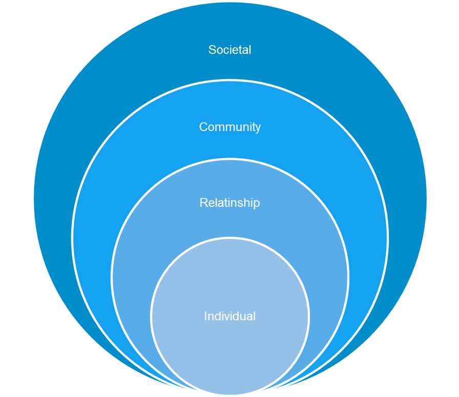 The public health approach uses an ‘ecological framework’ based on evidence that no single factor can explain why some people or groups are at higher risk of interpersonal violence, than others. This framework views interpersonal violence as the outcome of interaction among many factors at four levels—the individual, the relationship, the community, and the societal.
