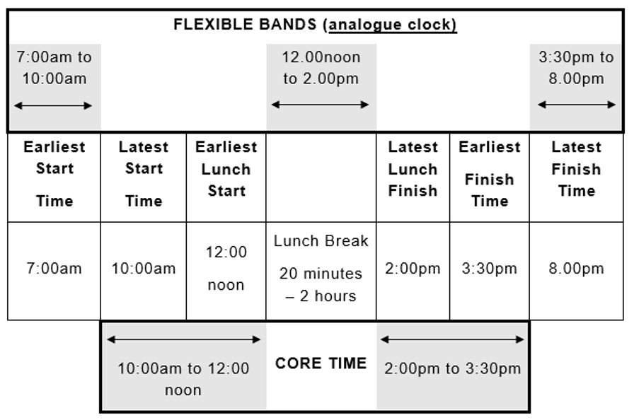 Flexible band start | Core time - am | Lunch break | Core time – pm | Flexible band end |