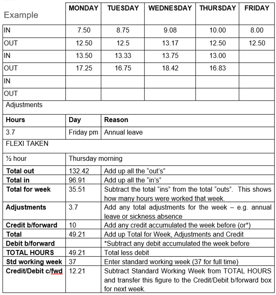 Some areas may still use a manual recording (paper-based) system, where in use the following example is provided and should be referred to ensure consistency in the recording of working time.