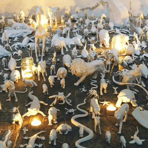 Ghost is made up of 100s of second-hand plastic animals painted a chalky white, arranged as a herd. They stand facing us, not only as a visual representation of very possible mass extinction, but also as an unflinching body of judgement. We, as humans have all done this and now the animals are demanding reflection and action.