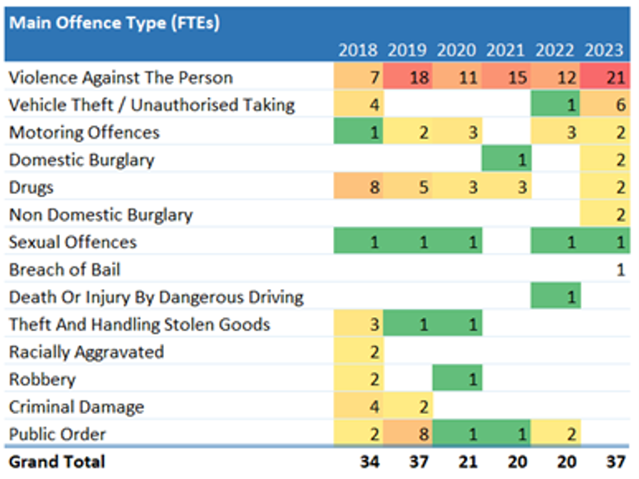Through the data we know that violent offences are the most common offence type linked to FTEs. Although it should be noted that in 2019 that there were a similar number of FTEs due to violent offences, the proportion was not as high: 49% in 2016 vs 57% in 2023. The increase of violent offences committed by FTEs highlights a trend of more serious offences that were not suitable for diversion from the formal Youth Justice System. The table below shows the main offence type committed by FTEs in Torbay.